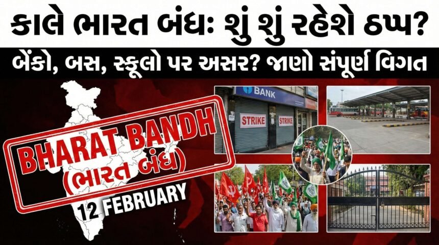 આવતીકાલે એટલે કે 12 ફેબ્રુઆરી, 2026 (ગુરુવાર) ના રોજ ભારતભરમાં મોટી હલચલ જોવા મળી શકે છે. Central Trade Unions અને Farmers’ Organisations દ્વારા એક Nationwide Strike (Bharat Bandh) નું એલાન કરવામાં આવ્યું છે. આ બંધની અસર સામાન્ય જનજીવન પર પડવાની પૂરેપૂરી શક્યતા છે. ખાસ કરીને Banking Sector, Public Transport અને અમુક રાજ્યોમાં Educational Institutions પર તેની ગંભીર અસર જોવા મળી શકે છે.