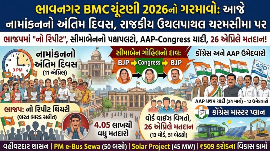 ભાવનગર મહાનગરપાલિકા (Bhavnagar Municipal Corporation – BMC) ચૂંટણી 2026નો ધમધમાટ પૂરબહારમાં ખીલી ઉઠ્યો છે. આજે, ૧૧ એપ્રિલ, ૨૦૨૬ના રોજ ઉમેદવારી ફોર્મ ભરવાનો અંતિમ દિવસ હોવાથી, શહેરના રાજકીય વર્તુળોમાં ભારે હલચલ જોવા મળી રહી છે. ભાજપ, કોંગ્રેસ અને આમ આદમી પાર્ટી (AAP) સહિતના મુખ્ય પક્ષો દ્વારા ઉમેદવારોના નામ જાહેર કરવામાં આવ્યા છે, અને કેટલીક જગ્યાએ આંતરિક વિખવાદ અને રાજકીય નાટકીયતા પણ સામે આવી છે. ભાવનગરના ૪ લાખથી વધુ મતદારો આગામી ૨૬ એપ્રિલ, ૨૦૨૬ના રોજ પોતાના મતાધિકારનો ઉપયોગ કરીને ભાવનગરના ભાવીને નિર્ધારિત કરશે.