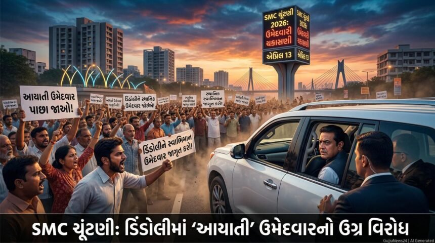 આજે, 13 એપ્રિલ, 2026 ના રોજ, ગુજરાતના ડાયમંડ સિટી સુરતમાં રાજકીય ગરમાવો ચરમસીમા પર છે, કારણ કે આગામી સુરત મહાનગરપાલિકા (SMC) ચૂંટણી 2026 માટે ભરાયેલા ઉમેદવારી પત્રોની ચકાસણી પ્રક્રિયા હાથ ધરવામાં આવી રહી છે. 26 એપ્રિલ, 2026 ના રોજ યોજાનાર મતદાન પહેલા, ઉમેદવારોની યોગ્યતા નક્કી કરતો આ તબક્કો અત્યંત મહત્વપૂર્ણ છે. જોકે, આ પ્રક્રિયા વચ્ચે, શહેરના ડિંડોલી (Dindoli) વોર્ડ નંબર 27 માં એક મોટો રાજકીય વિવાદ સપાટી પર આવ્યો છે, જ્યાં મુખ્ય રાજકીય પક્ષો દ્વારા ‘આયાતી ઉમેદવારો’ ને ટિકિટ આપવાના મુદ્દે સ્થાનિકોમાં ભારે રોષ જોવા મળી રહ્યો છે.