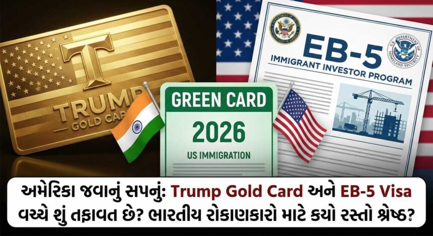 અમેરિકા (USA) માં સ્થાયી થવું અને ત્યાંનું Green Card મેળવવું એ લાખો ભારતીયોનું સપનું હોય છે. ખાસ કરીને 2026 માં, જ્યારે US Immigration landscape માં મોટા ફેરફારો આવી રહ્યા છે, ત્યારે રોકાણકારો (Investors) અને H-1B ધારકો માટે સાચી માહિતી હોવી ખૂબ જ જરૂરી છે. તાજેતરમાં ચર્ચામાં આવેલા “Trump Gold Card” અને વર્ષોથી ચાલતા વિશ્વસનીય “EB-5 Immigrant Investor Program” વચ્ચે શું તફાવત છે? શું Gold Card એ ખરેખર Green Card Backlog નો ઉકેલ છે? ચાલો આ વિષય પર વિગતવાર સમાચાર અને વિશ્લેષણ જોઈએ.